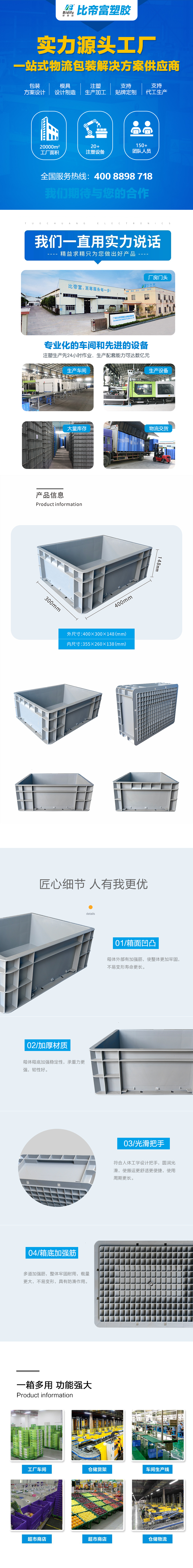 外尺寸:400*300*148mm 内尺寸:355*260*138mm 材质:PP 重量:850g